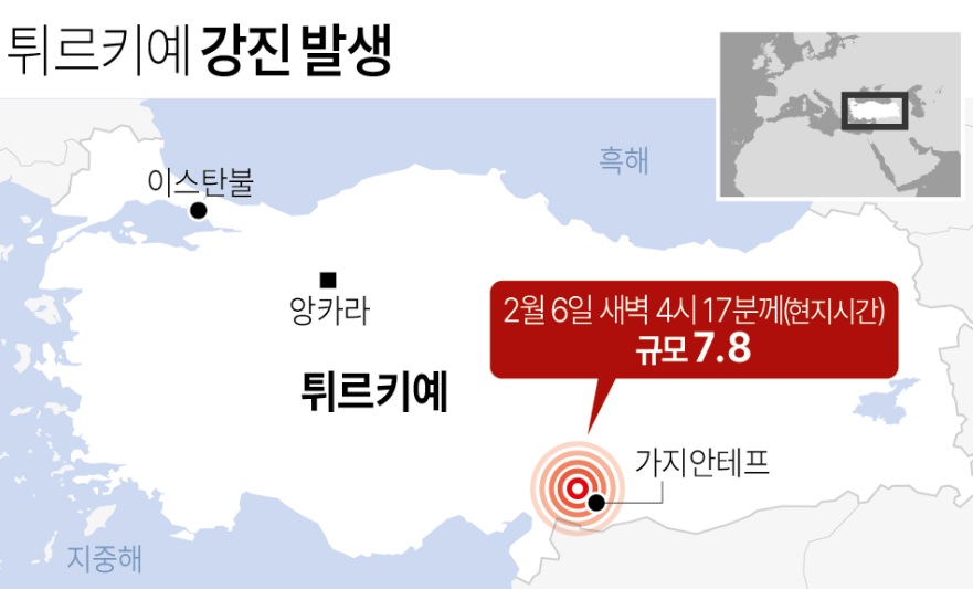 6일(현지시간) 튀르키예(터키) 남부에서 규모 7.8의 강진이 발생하면서 사망자가 3600명을 넘는 등 피해 규모가 눈덩이처럼 불어나고 있다. 여러 매체에서는 현재 튀르키예 지진 사망자 가 5000명이 넘는 것으로 밝혔다. 이에 국제사회는 깊은 애도를 표하며 신속한 지원을 약속으며 윤석열 대통령 또한 튀르키예 지진 피해에 도움을 주기 위해 긴급 지원에 나설 것을 촉구했다.