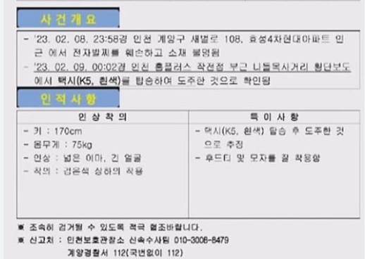 - 사건 발생 후 인천보호관찰소 서부지소는 A 씨의 얼굴 사진과 옷차림을 언론에 공개하고 제보를 요청했다. 키 170cm에 몸무게 75kg으로 검은색 상·하의를 착용하고 있다.
