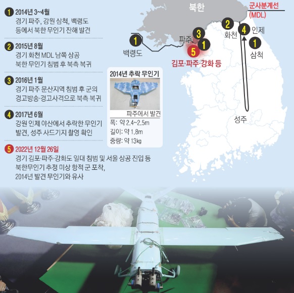 지난해 26일 우리의 영공을 침범한 북한 무인기 5대 가운데 1대가 용산 대통령실에서 3㎞ 거리 상공까지 침투했던 것으로 4일 확인됐다. 당초 군 당국은 북한 무인기의 용산 침투 가능성에 대해 “탐지된 것이 없다” “은평구 등 서울 북부 지역만 침범했다”면서 여러 차례 부인했다. 그러나 군과 정보 당국이 정밀 분석을 한 결과, 북 무인기가 대통령실 인근까지 정찰 활동을 하고 북한으로 돌아간 것으로 파악됐다는 것이다. 윤석열 대통령은 이날 이종섭 국방부 장관 등 안보 라인에 이 같은 내용의 보고를 받은 것으로 알려졌다.